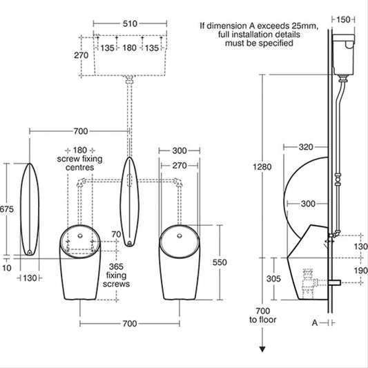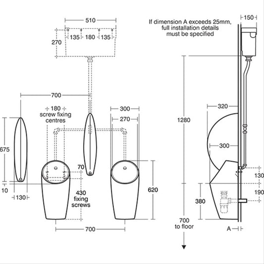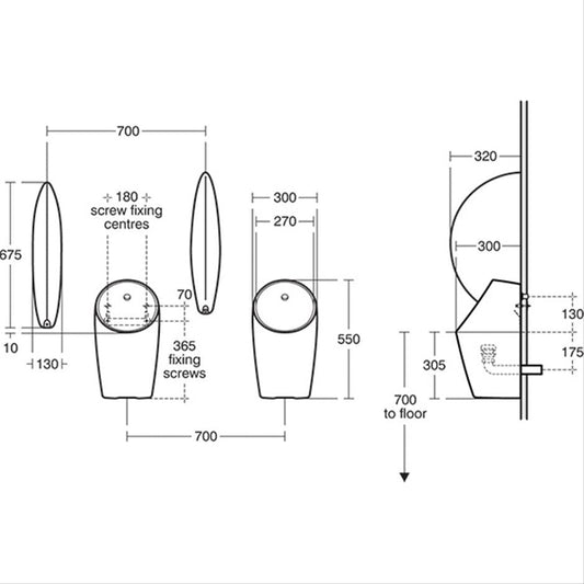 Armitage Shanks Sphero Midi urinal pack with concealed trap and open shroud