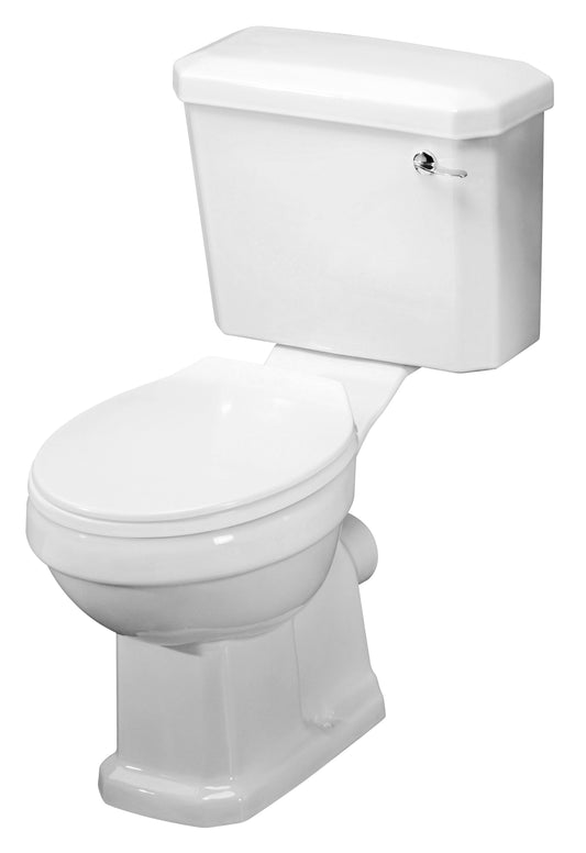 A close-coupled toilet features a cistern attached directly to the pan.