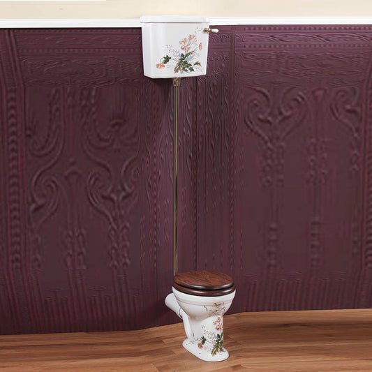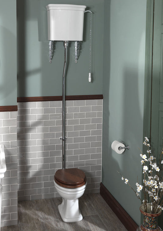 What characterised the high-level cistern toilets was that they featured an elevated cistern that was usually mounted high up on a wall but always left a visible flush pipe leading down to the toilet bowl. The design of these overhead cistern toilets follows back to early bathroom design, providing a timeless and elegant look.