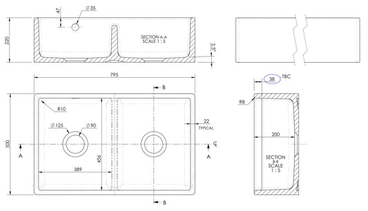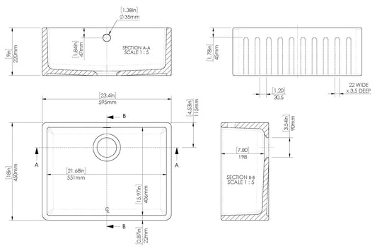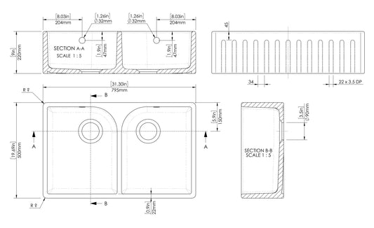 Nuie Butler Sink Stepped Weir & Overflow 795 x 500 x 220