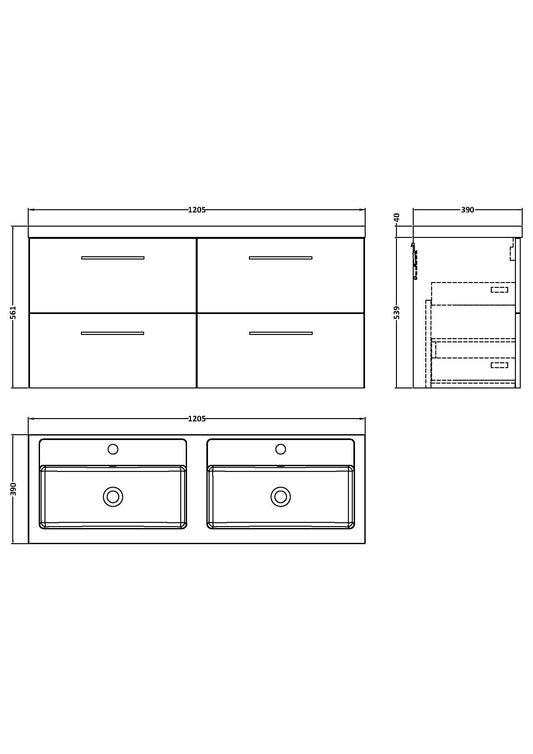 Nuie Arno 1200mm Wall Hung 4 Drawer Vanity & Double Basin/worktop