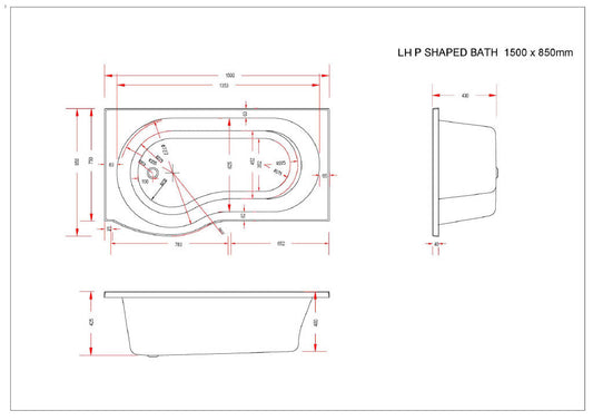 Scudo 1675mm x 850mm x 750mm P Shape Shower Bath - White