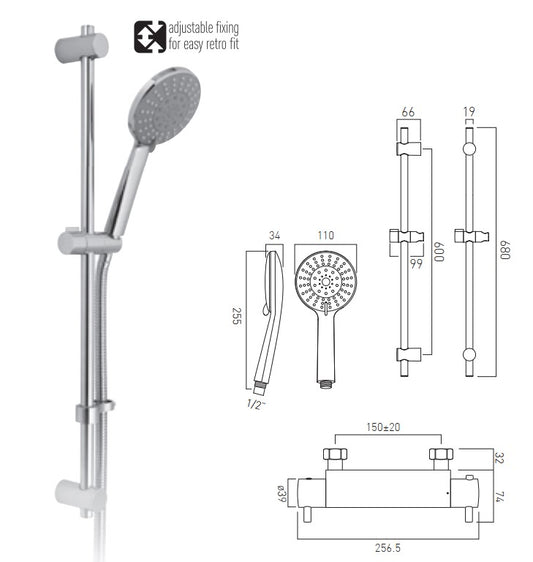 Vado Tablet Notion - 2 Outlet Thermostatic Vertical Shower set and Slide Rail Kit