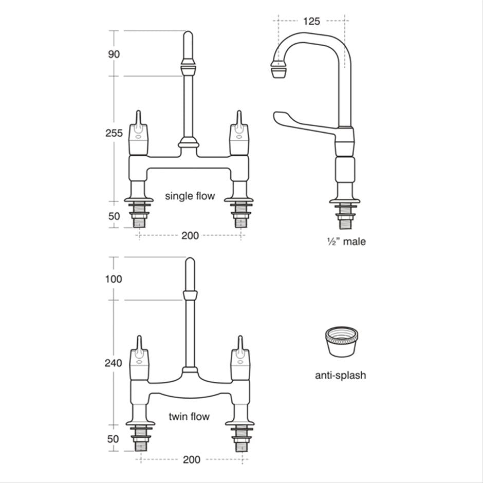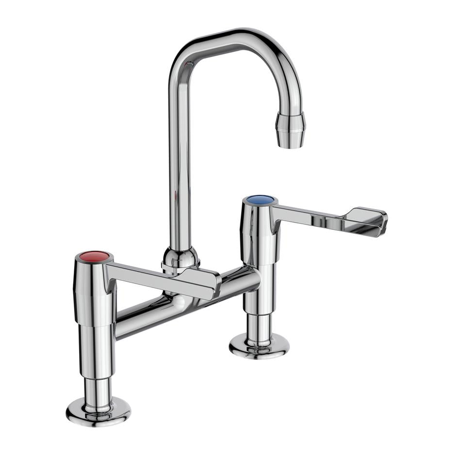 Markwik 1/2" rim mounted dual control mixer with 150mm levers and swivel spout. When taps are closed the levers are parallel to the wall. Suitable for low and high pressure systems. Single flow mixers require balanced supplies and appropriate back flow prevention.
